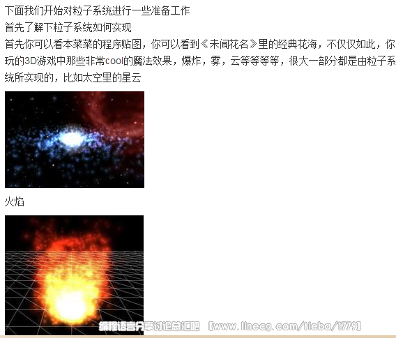 这些都是就拿我的范例程序来说,每一朵花就是一个粒子元,粒子系统就是绘制成百上千个这样的花到屏幕上,伴随着各种运动与各种效果,包括重力空气阻力风向加速度初速度等等等等,学过物理的都知道,通过这些参数我们可以计算出一个粒子的运动轨迹,粒子需要成百上千,所以只要你计算轨迹的算法有一个是龟速级别的,都可以让你的粒子动画卡成幻灯片,其实粒子可以归结为(1.位置 2.颜色 )就这么简单的两个,通常我们有如下方法计算一个粒子该有的位置与轨迹