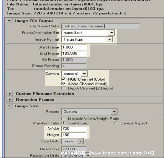 图7 在Common标签下设置图像和像素的大小。如果我是为了电视而制作的这个项目,为了达到正确的尺寸要求,我可以使用一下的设置:尺寸为720×480,像素长宽比0.900。记得,要为你的渲染指定相机,和图像格式,以及所希望的文件名排序的方式(我总是以Targa格式来渲染我的图像,因为它们包括了Alpha