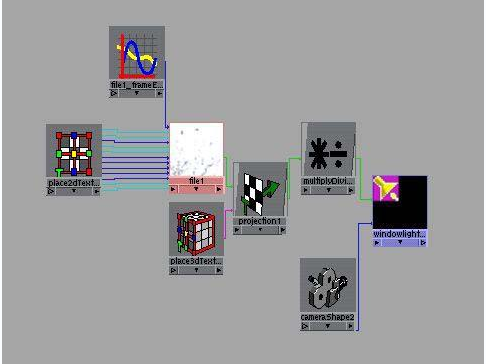 在 Hypershade 给聚光灯创造节点,a multiply/divide, a projection, a place3d Texture, and a texture 2D file.