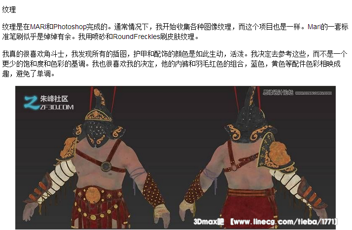 项目的来源来自于一本书,这个古罗马的角斗士没什么关系,主要是我读了一些东西,获得的灵感。在开始之前,我总是收集各种各样的参考,我不能分心,我通过网络收集各种各样相关的事物,收集服装武器饰品的照片,我决定在我的模型中使用这些。我不是肌肉男的粉丝,所以呢,我决定做一个更加自然的人而不是很多肌肉的肌肉男,我用自己的照片,做一些肌肉的参考。模拟人体身体的雕刻过程相当简单:大部分都是zbrush雕刻的,使用标准笔刷,以及自定义了一些笔刷。基本上,都是基本笔刷的微小调整(阿尔法35 ,硬度8 ) 。下面是我刷的小臂和小腿的肌肉。