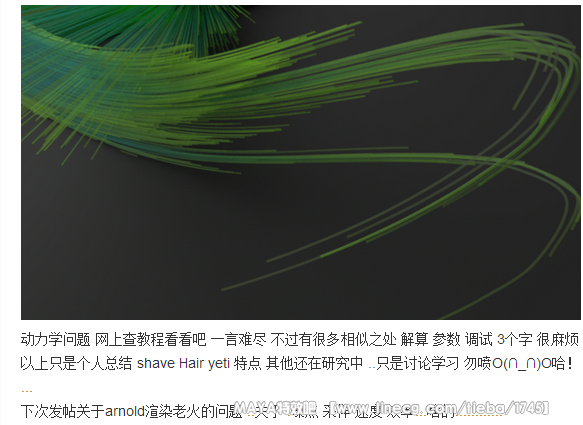 我最近从学arnold渲染 才认识到了yeti毛发 然后到sHave Hair yeti 整体认识 后面都渲染测试了一些毛发 当然很幸运拿到了冷大神的毛发教程 学到了一些 就开始玩 (毛)了 大概总结一下sHave Hair yeti 经验: