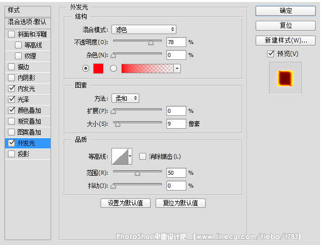 3、双击线稿层,设置图层样式的内发光,光泽,颜色参加,外发光参数分别为。