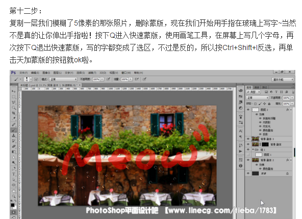 教程到此结束,如你所见,所用到的技术非常简单,只有图层样式、蒙版和基本滤镜,最重要的事是理解如何使用PS中的工具来创造各种效果,为了做出逼真效果,我花了几个小时的分析来得到一个雾蒙蒙的窗户的特征。