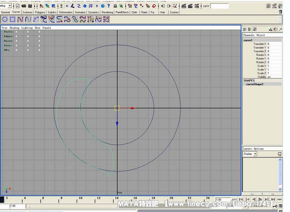 第二部分 实例讲解: 这节我们要做的是怎样建立一个门以及用设置驱动关键帧(Set Driven Key)来使它打开和闭合。驱动关键帧是maya里面的一种特殊的关键帧,它把两个属性数值连接在一起,当一个“驱动属性”发生变化时,另一个“被驱动属性”也会相应发生改变。 为了完成这个练习,比较关键的是除了群组外你还必须创建一个locator和增加一个叫“Shutter”的属性(add attribute),这个属性的范围是从0到10,10久相当于这个门被关闭的状态。 A. 简单说一下建模过程。设置Grid Options到缺省值。在原点创建两条Nurbs园环,radius分别为5和10,作为建模的向导。 1. 根据图例创建一个闭合的CV Curve 2. 复制曲线并移动Y轴到-0.2 3. 选择上一条曲线执行Surfaces→Planar。 4. 选择上下两条曲线执行Surfaces→Loft。 5. 删除曲线或删除面的历史。