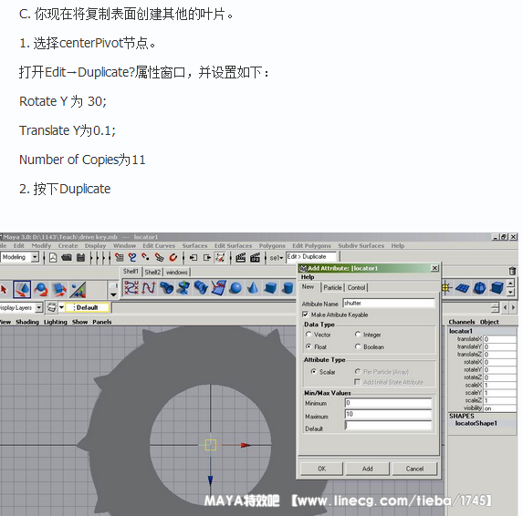 8. 在通道盒设置shutter的值为10。 9. 选择所有localPivot节点。在通道盒里击亮rotateY属性。 10. 使用虚拟滑条功能:在视窗中向左拖动中健直到门关上为止。 11. 单击Key. 好了,测试一下Set Driven Key吧。选择Locator并键入不同的值或使用虚拟滑条,现在shutter属性能控制门的动画了。你也可以试验用不同的曲线和不同的变换轴来产生不同的动画效果。 搞定收工~~~