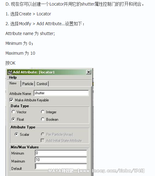 第一部分: 驱动关键帧是Maya里面的一种特殊的关键帧,它把一个属性数值和另一个属性数值连接在一起。对于一般的关键帧而言,是在某一个时间点上的。它的属性数值随着时间而动画。而对于驱动关键帧来说,是根据一个属性(驱动属性)来影响另一个属性(被驱动属性)的数值,如果一个属性值的动画会带动另一个或几个属性数值的变化。 驱动关键帧里的驱动属性有时往往是一个增加属性,而且习惯性的用在一个Locator来操作,所以我们先讲讲这两个概念! Locator是一种虚拟物体,它只是空间里的一个位置标记。一个小的指示显示。它自生的三条线分别沿着X,Y,Z轴显示,你可以用点捕捉去抓取它的位置,但它自身不能被渲染。选择Create→Locator能直接创建它。 Add Attribute是属性编辑器里的一个命令,属性编辑器主要用于查看或设置物体或者节点的基础属性。选择window→Attribute Edior或同时按下Ctrl键和A键可进入属性编辑器。