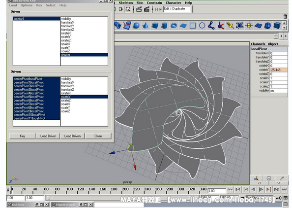 E. Locator现在需要连接到localPivot的旋转属性。你要使用Set Driven Key来达到这个连接。 1. 选取所有的12个localPivot节点。 2. 打开Animate Set Driven Key Set?属性窗口 3. 当前localPivot已都被选择,按下Load Driven 4. 在Driven的左边一栏选择所有的localPivot,右边一栏选择rotateY。 现在读取Locator作为驱动属性节点(Driven) 5. 选择Locator,按Load Driver 6. 在Driver的左边一栏选择Locator,右边一栏选择属性shutter